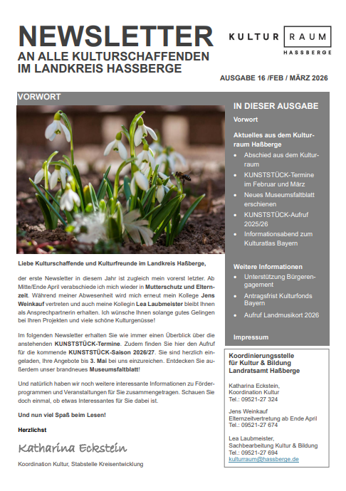 Der Kultur-Newsletter erscheint vierteljährlich und wird per Mail versendet. Haben Sie Interesse unseren Newsletter zu abonnieren? Schicken Sie eine kurze Mail an kulturraum[a]landratsamt-hassberge.de und wir nehmen Sie sehr gerne in unseren Verteiler auf.
